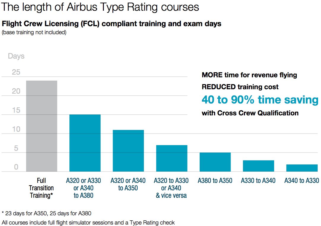 Flight operational commonality between Airbus aircraft having separate Type Certificates and requiring separate Type Ratings varies from 40% for the A320-A380 to 90% for the A330-A340 combination, measured as a reduction in pilot transition training days relative to a standard Type Rating course duration.